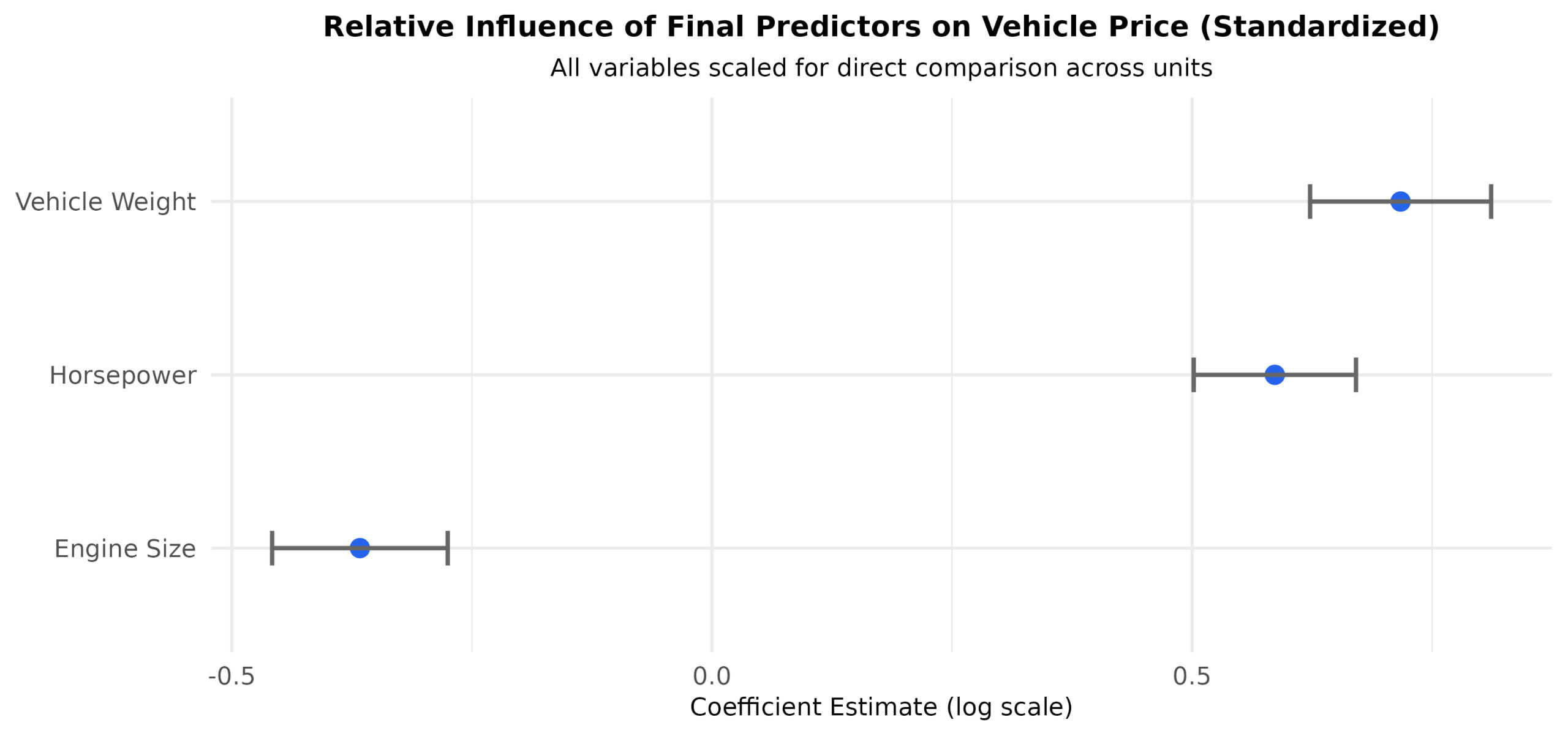 At a glance: Interpretable 3-feature model (engine size, horsepower, weight) with price estimates.