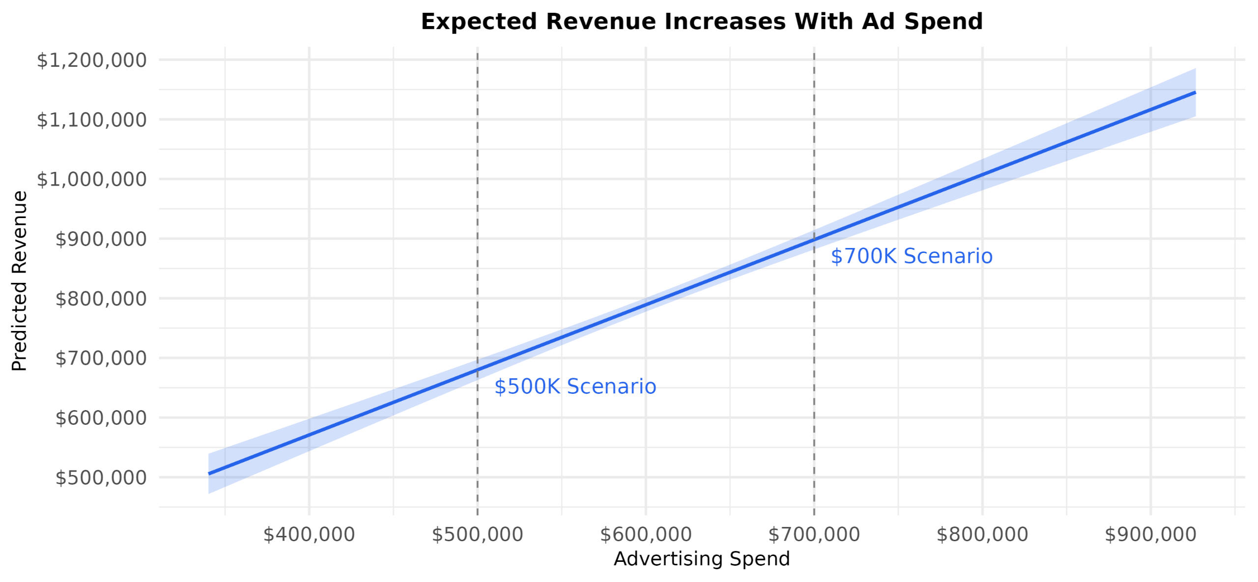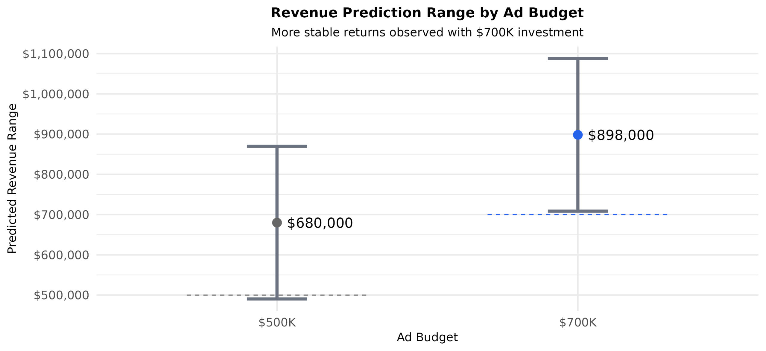 At a glance: Recommended $700k (vs $500k) for lower volatility and consistently positive ROI.